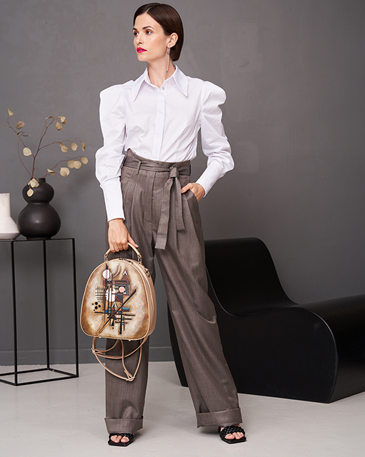 Высокий манжет, широкий акцентный рукав «от плеча», перламутровые кнопки, тонированные в цвет ткани, и удлиненный воротничок - реверанс романтизму.